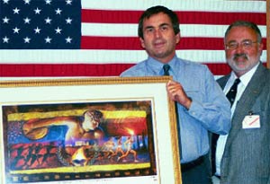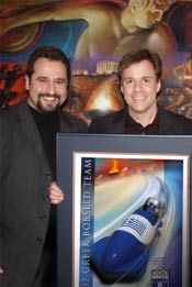 Bob Costas, Primetime Host for NBC coverage of the 2002 Salt Lake and 2004 Athens Olympic Games holds up the official Greek Bobsled Poster by Rip Kastaris.