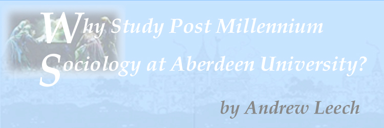 Yes, reading Post Millennium Sociology is academically sound, yet fun, at Aberdeen University; where you learn how to face and deal with some of the most enigmatic and controversial psyches, vagaries and behaviour found within the shell of humanity. Couple that choice with Psychology and the one department might well supply the grist to study in the other. Equally, you could enrol for Film Studies and possibly have the opportunity of making an animated cartoon feature of those dedicated Dickensian characters huddled in their plaid dressing gowns, giggling and energetically waving toasting forks as they greedily slap honey and haggis paste onto steaming crumpets and scheme up delightfully interesting new initiation rites for future students; all designed to prod the cerebral learning centre and foster the increased interest in Sociology that the course, which we unreservedly endorse, deserves.
