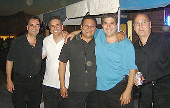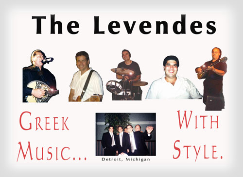The Levendes started as kids in 1975 and have been together for 30 years giving each member of the Levendes an average of 28 years stage experience. They started playing weddings, festivals and dances and have performed for countless audiences across the U.S. and Canada. They give a unique flair to traditional and Modern Greek music with a vast repertoire of Dimotika, Rebetika and modern Laika. They have performed with many Greek stars ranging from the Trio Bel Canto to Yiannis Parios. Members of the Levendes collectively have 11 professional recordings to their credit including the four popular Levendes CD's "Welcome to Greektown," "Taverna," "Mediterranean Montage" and "Athens After Dark". In 2006, The Levendes released their fifth CD, “Double Exposure” in which they take Greek music to a new level. Pete Alexander started the band in 1975. Pete is considered the heart and soul of the Levendes by other band members. His unique interpretations of Greek music have withstood the test of time. Pete started playing bouzouki at age 10 and anchors the group. He is the lead vocalist of the Levendes and has made the group what it is today. His solid bouzouki playing and his ‘Frank Sinatra’ flair to the lyrics give a new texture to Greek music. Above all, Pete's golden voice is a major component of the well-known "Levendes sound". Chris Shafkalis, who became a Levendi in 1980, is the solid ‘core’ of the Levendes. Chris started his musical career at age 13 and hasn’t ceased to excel since. His ability on the keyboards is second to none. He is the musical ‘brains’ of the group and is responsible for giving the Levendes the perfect sound. His technological and computer expertise has allowed the Levendes to capture a modern sound to even the oldest dimotika songs. Chris is able to walk this musical "tightrope" expertly in that the original integrity of the old songs is never lost. His knowledge of music allows him to play bass and keyboards together, while completing the Levendes classic 3-part harmonies-all at the same time. Chris could truly be a ‘one man band’. Harry Harris (originally Herouvis) joined the band in 1981. He is the ‘voice’ of the Levendes and is the band spokesman. Harry adds a humorous flair to his job as master of ceremonies with the Levendes and has the ability to capture and coordinate any affair. His musical education in jazz and folk guitar along with his Greek background adds spice to the traditional Greek music. Harry’s unique ideas compliment and inspire the group’s sound. He is also a harmony vocalist. Along with Chris, Harry also coordinates the bands extensive American music repertoire. Phil Lampos, who joined the band in 1984, rounds out the Levendes. He is affectionately known as ‘the money man’ because you can count on Phil not to miss a beat. His driving drum rhythms won’t let your feet stop moving and will make you want to dance all night long. You can count on him to fill the affair with kefi and energy. His excitement travels through his drums and ignites the band. In 1999, Johnny Pappas became the ‘5th’ member of the Levendes. Johnny, affectionately known as ‘yiatre’, has performed all over the U. S and Canada as well as panagiria and cruises in Greece. Johnny’s musical career started at the age of nine and by 12 made his first recording. Johnny has 30 years on the bouzouki and also adds a second lead vocal to the group. Together with the 'patriarch' of the group, Pete Alexander, Johnny and Pete give the Levendes a dynamic, sweet harmonizing bouzouki sound |