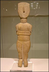 Grey areas Yannis, the middleman turned police informer, told the programme how the network operates. Some of the Cycladic figurines can fetch millions of Euros "The looter often knows the middleman so he may smuggle to order. The antiquities then go abroad - usually first to dealers in Switzerland and Germany. This happens by lorry and by boat," he said. "Thousands of trucks leave Greece every day and the objects are hidden in boxes and food, like watermelons." He continued: "Some objects such as Cycladic figurines can fetch millions of Euros. They are among the most valuable antiquities in Greece today." |