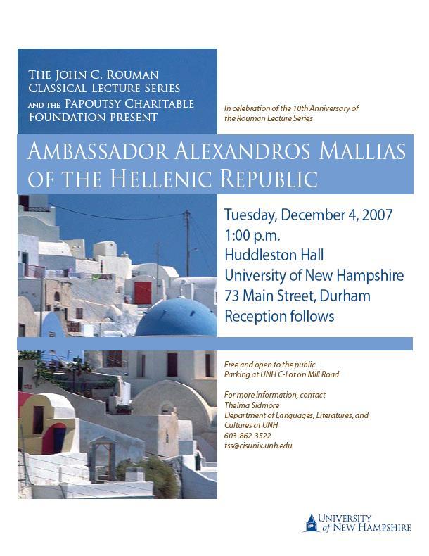 Ambassador of Greece to the United States, Alexandros P. Mallias will visit Boston, as well as Cranston and Providence, RI, and Durham, NH, (Dec. 1 – 6, 2007), where he will attend a series of events, meet with American officials, Greek Community leaders, and members of the business and academic communities. During his visit, Ambassador Mallias will also speak at Boston University, the University of New Hampshire and the Economic Development Corporation of Rhode Island.