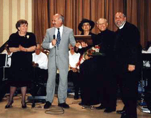 Manchester, NH--On Saturday, May 18, 2002, St George Greek Orthodox Cathedral hosted a successful annual evening dinner-dance at its facility in Manchester. A capacity crowd dined on sumptuous Greek cuisine and pastries and listened with great enthusiasm to the sophisticated sounds of the 25-piece Hellenic and Near Eastern Musical Society Orchestra. Led by former Cathedral parishioner Christos Papoutsy, the orchestra received a standing ovation for its fine musical contribution to the affair. Current parish president and chairman of the event, Mr. George Copadis, presented Mr. and Mrs. Papoutsy with a plaque, on behalf of the entire cathedral community, honoring their "philanthropic and dedicated service to promoting and preserving the Greek Orthodox culture and heritage." |