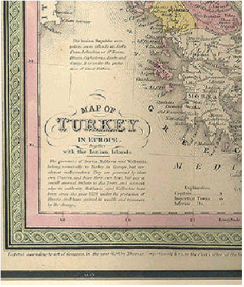 ![]() prises seven islands viz. Corfu, Paxu, Lefcathiaor St. Maura, Ithaca, Cephalonia, Zante, and Cerigo. It is under the protec- tion of Great Britain. The provinces of Servia, Moldavia and Wallachia, belong nominally to Turkey in Europe, but are almost independent. They are governed by their own Princes, and have their own laws, but pay a small annual tribute to the Porte, and acknowl- edge its authority. Moldavia and Wallachia have been since the year 1829, under the protection of Russia, and have gained by wealth and resources, by the change. I learned that antique maps are more than attractive wall decorations. They are documents that record the geopolitical reality of their time. In 1850, Great Britain controlled the Ionian Islands, having succeeded to their rule following centuries of control by the Byzantine Empire, the Venetian Republic, France, Russia, and France, yet again. In the end, Great Britain succumbed to increasing demands on the part of the Greek population of the islands for enosis, or union with Greece, and finally ceded the islands to the Greek Kingdom in 1864. Serbia became a fully independent state in 1878, at the same time that the principalities of Moldavia and Wallachia were merged into the new state of Romania. These changes came about as a result of the Treaty of San Stefano that ended the Russo-Turkish war of 1877-78. Russian forces had reached the Sea of Marmara, and, but for the intercession of the Great Britain, would have taken Constantinople. The 18th and 19th century histories of Serbia, Moldavia, and Wallachia are part of the drama of the decline of the Ottoman Empire that resulted, after more than a century, in the states that exist in the Balkans today.