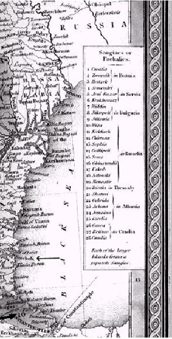 A Sangiac, in the nineteenth century, was a sub-province of a larger administrative region named Vilâyet (governed by a Pacha, hence also called a Pachalic 2 ). Identif ied by the arrow in the section to the right is the small city that interested me especially: Sizeboli. The map shows it to be in Sangiac #11, which is named Kirkliseh, and contained in the Vilâyet, or Pachalic , of Rumelia. In 1878, following the Russo-Turkish war, Rumelia was made an independent province, subject to the Sultan in Constantinople, but governed by an Orthodox Christian. Within three years it was annexed by the new state of Bulgaria, and was thus removed from under the Ottomans. Nonetheless, Sizeboli, or Sozopolis, was essentially still a Greek city, as it had been since its founding in the 7th century B.C. by Greeks from the Ionian city of Miletos , who originally named their colony Apollonia Pontika. I searched on the internet for websites and books about maps, and was rewarded with a wealth of reference material. My first purchase was the book Antique Maps, by Carl Moreland and David Bannister.3 Unfortunately, the book made mention neither of Thomas Cowperthwait nor of my map. It did contain a lot of information about antique maps, biographies of mapmakers, and a good bibliography. The internet search also produced a list of map dealers in Germany, Holland, Great Britain and the United States.One of these was the Argosy Bookstore on East 59 th Street in New York City. 2 Differences in spelling, e.g., pasha vs. pacha or pasa, and are common in texts produced at different times and by different writers. 3 Carl Moreland and David Bannister, Antique Maps, 3rd ed. (London: Phaidon, 1993). Next Page: An Incomplete Geography |