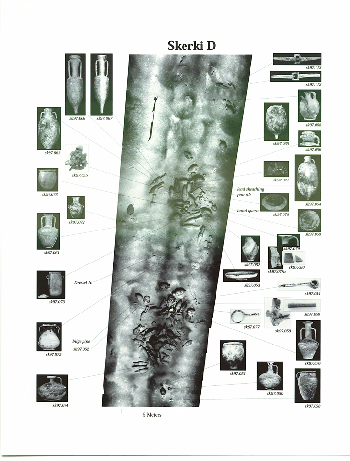 Now the fishing lagoon is silted over and used as pasture land. But in Roman times a remarkable commercial complex existed at Cosa including: the harbor with concrete piers, a lighthouse, a commercial fish farm, factories for making amphoras, wine and fish products along with machinery for lifting fresh water from a gushing spring all protected by a temple to Neptune on the hill above. Controlled and probably financed by the famous Sestius family who had an estate in the area and also probably owned ships, their wine and garum jars dominated trade in the western Mediterranean in the last quarter of the second and early first centuries B.C. The Sestii were one of the earliest exporters of Italian wine in the western Mediterranean and their enterprise goes back at least to the latter third century B.C.11 Skerki Wreck D provides startling new evidence for the importance of the port of Cosa and the export trade in wine and fish sauce by the Sestius family. |