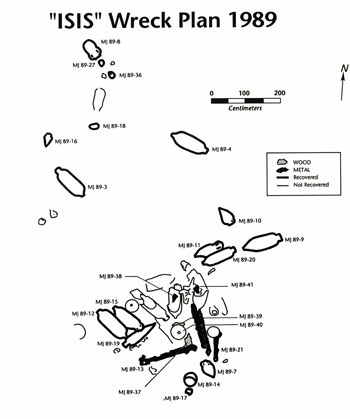 Other finds include a rare, small amphoretta from Mauritania 32 and a basalt millstone from Libya 33 of a previously unknown form. Pieces of cedar deck planking 34 and a beam of white oak 35 were recovered with mortise- and- tenon joinery. The joints were widely spaced as is normal for late Roman ships. That the "Isis" may have been an older ship when she went down is suggested by the use of some lead patching and reused timber. It also should be remembered that North Africa was the source for the wild animals so in demand for entertainment in the great colosseum in Rome and any ship coming from Carthage may well have included them in her cargo as well as textiles, sacks of grain and other biodegradable cargo. |