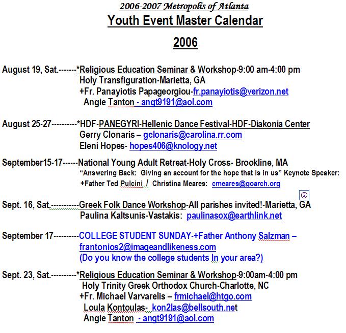 HCS readers can view other articles about or by the Greek Orthodox Metropolis of Atlanta in our extensive, permanent archives at the URL http://www.helleniccomserve.com/archivemetropolisatlanta.html. For more information about the Atlanta Metropolis or its Department of Youth and Young Adult Ministries, contact Michelle Cassimus, Youth Coordinator at 404-634-9345 or youth@atlmetropolis.org. See also the website of the Metropolis at the URL http://www.atlanta.goarch.org. The Metropolis falls under the ecclesiastical jurisdiction of the Greek Orthodox Archdiocese of America (http://www.goarch.org) and the Ecumenical Patriarchate of the Orthodox Church at Constantinople (http://www.patriarchate.org). |