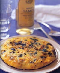 This is one of many Greek omelets that call for greens. Serve this with Greek Fries (page 98), wrinkled black olives, and crisp white wine or retsina. MAKES 8 SERVINGS 4 cups coarsely chopped chard or spinach 3 tablespoons extra virgin Greek olive oil 1 medium red onion, finely chopped 2 tablespoons good-quality tomato paste 1 ½ cups (about 6 ounces) crumbled Greek feta 5 large eggs, lightly beaten Salt and freshly ground black pepper 1. Wash and drain the chard very well. Heat the olive oil over medium heat in a 10- or 12- inch nonstick skillet. Add the onion, reduce the heat to low, and cook, stirring, until the onion is wilted and lightly golden, or 12 to 15 minutes. Add the tomato paste and stir. Add the chard or spinach and season with salt and pepper. Raise the heat to medium, stir all the ingredients together, and cook until the chard is wilted and all of the pan juices have cooked off. 2. Add the feta and stir until it has nearly melted, or 5 to 7 minutes. 3. Beat the eggs with a little salt and pepper. Add them to the skillet and tilt it so that the eggs go all over, covering the entire surface of the pan. Do this several times as they cook, so that the omelet is dry and fluffy and not at all runny. Adjust the seasoning with additional salt and pepper and serve warm or at room temperature.