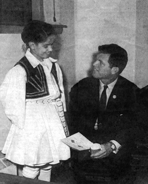 The photographs he proudly displays eloquently translate his pride in and love for America, and his appreciation of what his Greek heritage has instilled upon him. One depicts his grandfather, Christy, his father, Peter, and his uncle, James all proudly wearing the uniforms of the Armed Forces of the United States. Another (shown at right) shows Christy in an evzon [royal Greek guard and mountain freedom-fighter] uniform, in conversation with U.S. Senator Edward M. Kennedy (D-MA). Another favorite photograph portrays the humble family store, Christy’s Market, in Brockton, MA taken in the 1920s. And a fourth places Christy at the 1986 Laity Awards Dinner with Metropolitan Methodios, when he, then President of the Parish Council of the Panagia Church in Cohasset, MA,was chosen by the community to received the Laity Award. |