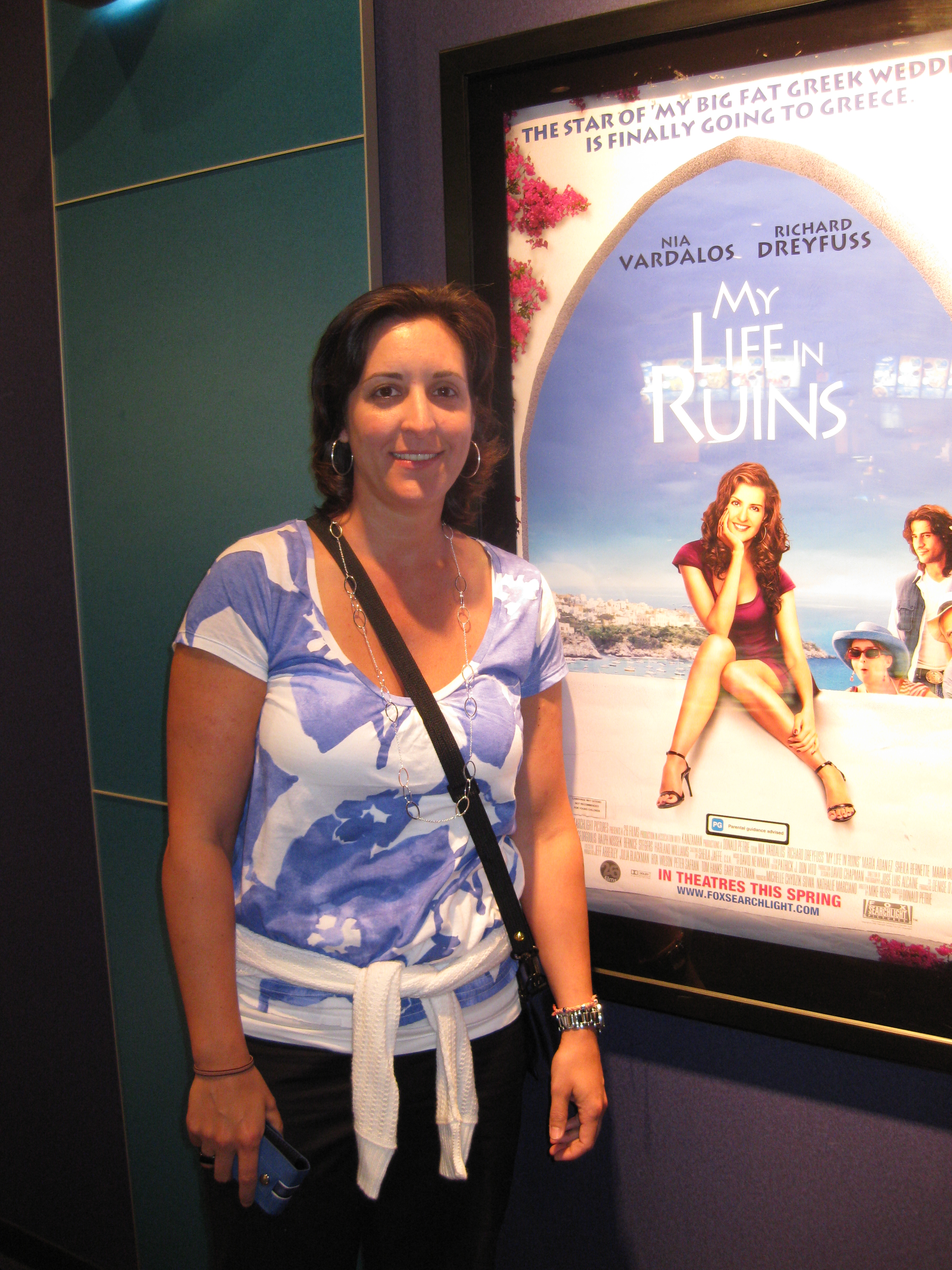 Film Review By April Kalogeropoulos Householder Nia Vardalos' long-awaited film, My Life in Ruins quietly opened this weekend in the U.S., without the benefit of big advertising dollars from Fox's Searchlight Studios. The film is centered on Vardalos' character, Georgia, an out of work Greek-American classics professor who comes to Greece to find her "kefi", and in the meantime, works as an English-speaking tour guide of the ancient monuments. Her boss favors a rival guide, Nikos, who gets top marks on his evaluations by pandering to the toursists' Western desires for beaches, tavernas, shopping, and ice cream, over the more historical (and boring) information doled out by Georgia. Nikos gets the bus with air conditioning and is assigned a better tour group, |