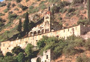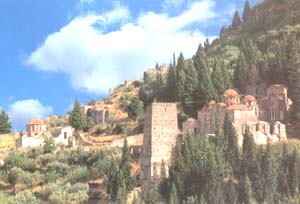 Under the bright sun, the ruins of the Byzantine town of Mystras radiate a mysticism other places are capable of only in the moonlight. This steep, rocky hill at the foot of Mount Taygetos is covered with; churches and the remnants of palaces and homes. A collection of ruins amphitheatrically spread among cypresses and pines, the hill had for centuries enchanted travellers, even inspiring visions and hallucinations. It is bound to impress you too, even in this age where the silence is intermittently disturbed by tourist crowds. The slope of the rocky mass dominating the Sparta plain is heavy with history, legends and symbols. Yet the town's dramatic past is little known, not only abroad but also in Greece. In the narrow alleys of the castle-town, the flame of Byzantium kept illuminating the Greek world in an era of rapid decay. Here, the Modern Greek national conscience was born. |