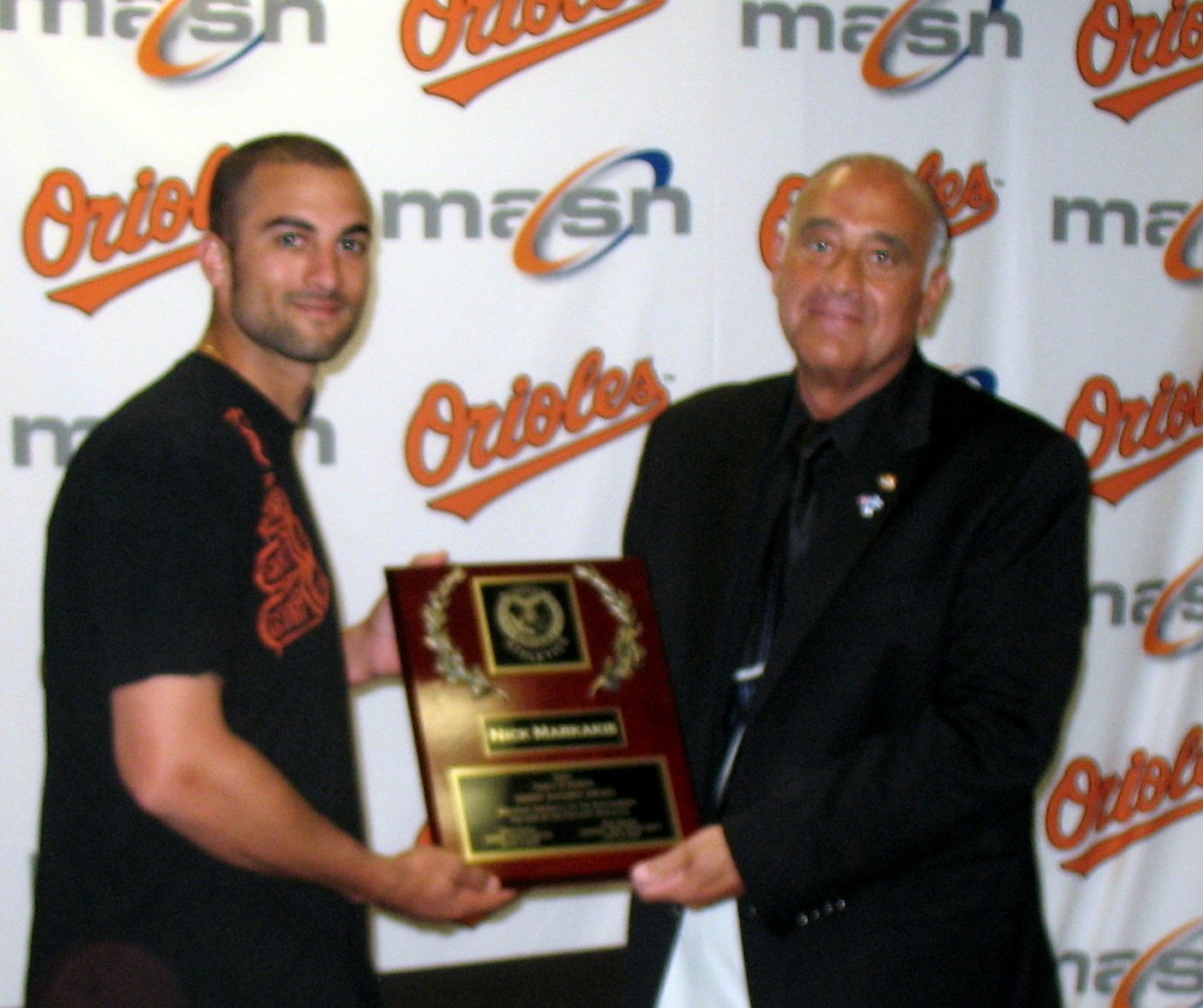 WASHINGTON (June 17, 2009)Professional Baseball Player Nick Markakis, of the Baltimore Orioles, joined the American Hellenic Educational Progressive Association (AHEPA), a leading association for the nation's three million American citizens of Greek heritage, and countless Philhellenes, on May 29, 2009, at an induction ceremony held at Camden Yards, announced Supreme President Ike Gulas. Markakis joins Lord Baltimore Chapter 364, one of the largest in AHEPA Capital District 3. |