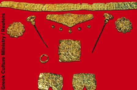 ![]() Gold jewellery and ornaments, excavated in northern Greece, are depicted in this handout photograph distributed by the Greek culture ministry, on September 11. Archaeologists have unearthed gold jewellery, weapons and pottery at an ancient burial site near Pella in northern Greece, the birthplace of Alexander the Great |