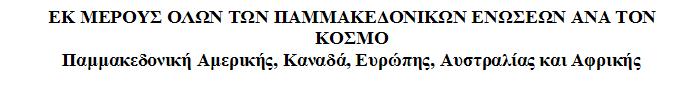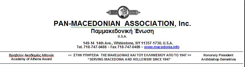 HCS readers may wish to view other articles or releases in our extensive, permanent archives concerning the Pan-Macedonian Association and issues relating to Macedonia under the Macedonia Series of the site archives at http://www.helleniccomserve.com/contents.html. The Pan-Macedonian Association was founded in 1947 with the goal of uniting all the Macedonian societies of the United States. It is a nationwide membership organization for Greek Americans whose origins are from Macedonia, Greece. The organization promotes the culture, language, history and traditions of Macedonia and Promotes charitable projects and works to benefit the region and its people. It strives to educate its members and the general public on various issues pertaining to Macedonia, especially the Hellenic origin and nature of the name Macedonia and to counter falsifications and distortions of history with respect to Macedonia. For more information about the Pan-Macedonian Association of America, established in 1947 and active nationwide in the Greek-American community, visit the organization's website at http://www.panmacedonian.info/ |