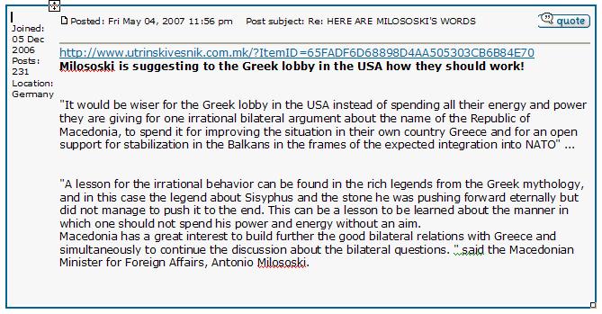Be that as it may, the Random House dictionary under the entry "Sisyphus" states: “A son of Aeolos and ruler of Corinth, noted for his trickery; he was punished in Tartarus by being compelled to roll a stone to the top of a slope, the stone always escaping him near the top and rolling down again.” It is very appropriate that Mr. Milososki and his countrymen realize that trickery does not pay and that they are condemned by the goddess TRUTH to perpetually fail in their attempts to convince the world that they are “Macedonians.” In short, Sisyphus’ act was not an example of irrational behavior, as Mr. Milososki claims, but the price he had to pay for indulging in trickery, an act, no doubt, very familiar to Mr. Milososki and his fellow FYROMians. Panos D. Spiliakos Supreme President Pan-Macedonian Association, Inc. USA |
