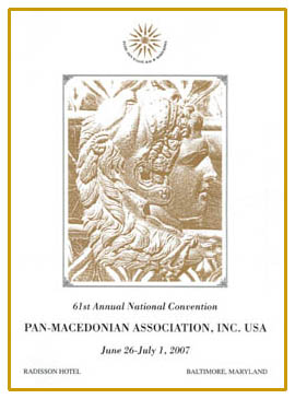 A strong message was delivered by the Pan-Macedonian Association USA, in the city of Baltimore, MD where the 61st National Convention was carried from June 26 until July 1, 2007. Prior to the opening of the Convention, which was blessed by His Eminence, Metropolitan Evangelos of New Jersey, an academic conference took place in the Capital Hilton Hotel in Washington, DC titled, A Search for a Roadmap to Peace in the Balkans. Non-Greek and Greek academicians and experts sent everywhere a strong message that the successors of Alexander the Great established the Hellenistic period and were indubitable Greek. The hoe of the archaeologists in all parts of the Hellenistic East was excavating nothing other than monuments and coins with Greek forms, insignias, and inscriptions, similar to those that were discovered in the territories of Greek city-states of that time. Dr. Potitsa Grigorakou from the Open University of Athens was the Coordinator of the morning panel. Archaeologist Professor Pierre Leriche from Centre d' Archeologie pour l' Orient of Paris via a power point presentation informed the audience about the monuments and the architecture of the Hindo-Hellenistic East, while Dr. Osmund Bopearachhci, from Centre D' Archeologie, E.N.S. Paris presented an abundance of currencies of the Hellenistic era on which the Greek language is engraved and leading figures with Greek names are depicted on them. |