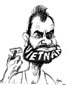 Bostonians will have a chance to judge for themselves when a retrospective of over 100 pieces of Papas' original artwork opens at the Maliotis Cultural Center in Brookline on October 5, 2003. Known worldwide in the sixties as the political cartoonist of London's Guardian, Punch Magazine and Sunday Times, Papas parleyed his tremendous artistic talent into cartoons and book illustrations that were pungent, succinct but never destructive. Frequently he went against the editorial line but his wise editor, Alistair Hethrington, never reined him in and it was rare for one of his cartoons not to be published. Papas left cartooning in 1972 (he returned to it briefly in 1992) and retired to the small Greek village his father had left in 1900.