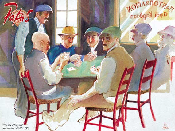 The retrospective of his work at the Maliotis Cultural Center that opens on October 5th will cover the full spectrum of Papas' artistic career. It starts with early sketches done while sitting on street corners in Europe in the late forties, continues with early South African work while he was an artist/reporter for the Cape Times and follows his career as a cartoonist, illustrator and artist in London and Greece. A number of pen and ink works from his travels throughout Greece in the seventies are included as well as watercolors of USA, Italy, Japan and Jerusalem. For more information, contact Lee Tamis, 617-522-2800 ![]() |