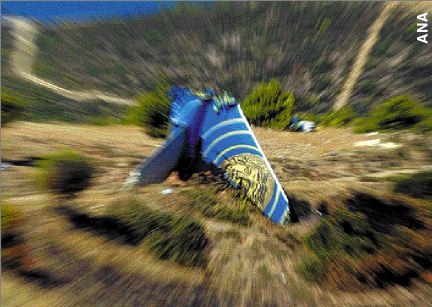 14-22 August 2005: A zoom-out picture of the tail of the Cypriot Helios Airways charter plane lying on a hillside in Grammatiko, 40km north of Athens, marks the spot where the Boeing 737-300 crashed on August 14 last year, killing all 115 passengers and six crew on board. The worst air-disaster in Greek history has baffled investigators from the outset on August 22 when their two-page preliminary report to the transport ministry implied that the doomed airliner had been flying pilotless across the Aegean for nearly three hours before it crashed, with both pilots apparently debilitated by lack of oxygen due to decompression |