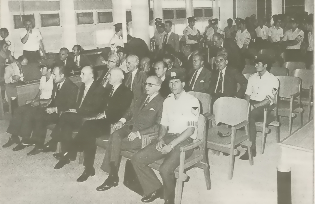28 July 1975: The men who formed a clandestine army junta that orchestrated the 21 April 1967 military coup d'etat grimly face charges of high treason at a special tribunal of appeal court judges chaired by high court magistrate Ioannis Deyiannis. The trial lasted less than a month and focused only on the defendants'role in the overthrow of democratic institutions rather than their participation in the preparations for the coup and the day-to-day running of the seven-year military dictatorship headed by a 'troika' of colonels- George Papadopoulos (seated first row, 2nd from L), Nicholas Makareios (seated first row, 3rd from L) and brigadier |