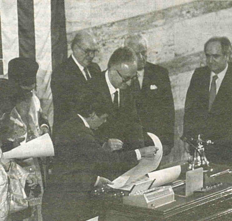 30 March 1985: Twenty years before the current conservative prime minister, Costas Karamanlis, endorsed the election of a president from the ranks of the opposition Pasok party, the socialist prime minister Andreas Papandreau did exactly the opposite. Much to the surprise of even his closest confidants, Papandreou decided on 9 March 1985 to withdraw his ruling party's support for a second term of Constantine Karamanlis as president of the republic, instead backing the noted jurist and Supreme Court prosecutor, Christos Sartzetakis, for the job of head of state. Sartzetakis (centre) is seen taking the oath of office on 30 March 1985, with |