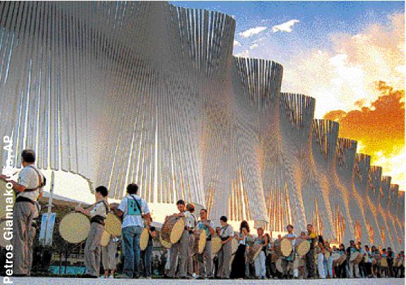 August 2004: The sun sets over a huge wind sculpture, The Wall of Nations, in the OAKA Olympic Complex in Athens while hundreds of volunteer drummers prepare for a dress rehearsal of their act at the opening ceremony of Athens 2004 Olympic Games, due a week later on August 13. Athens managed to finish its Olympic works in the nick of time, even as athletes, officials and journalists began to arrive at the airport. The transport network was finally up and running, the stadiums were ready and even landscaping efforts were nearly complete. |
