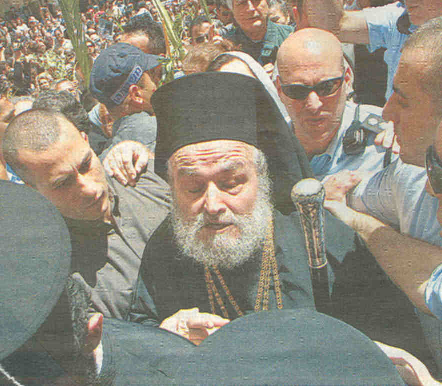 5 May 2005: A long-brewing schism at the Greek-Orthodox Patriarchate of Jerusalem breaks out into the open shortly after Easter celebrations, as over a dozen bishops denounced Patriarch Eirinaios (photo) on May 5 and declared they no longer recognise his official acts. The rebellion came on the heels of incontrovertible proof that Eirinaios' advisor had leased church property at the Jaffa Gate in the Old City of Arab East Jerusalem to Jewish investors, sparking the outrage of Arab Christians in the Holy Land. Some Israeli journalists believe a branch of the Israeli state leased the land, namely the Himnuta company, a subsidiary of the Jewish National Fund, working through an offshore |