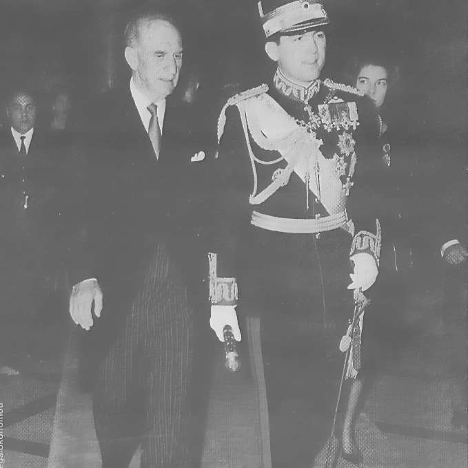to Papandreou, the king refused to endorse his replacement of Garoufalias, accusing the prime minister of condoning the ASPIDA caucus of democratic officers as 'a plot to install a military dictatorship of the most despicable kind'. Papandreou's polite reply reminded the young monarch of the premier's constitutional prerogative to choose his cabinet members I and blamed Constantine's meddling in government affairs on his 'lack of experience' and the 'influence of sinister royal counsellors'. At a meeting between the two men in Corfu on the occasion of the birth of Constantine's daughter Alexia on July 14, the king offered to accept Garoufalias' dismissal but only on condition that Papandreou would not take over the defence portfolio himself. 'I will not be a prime minister under royal prohibition,' Papandreou responded before tendering his resignation. Photo shows Papandreou (L) escorting Constantine to his enthronement ceremony in parliament on March 23, 1964 |