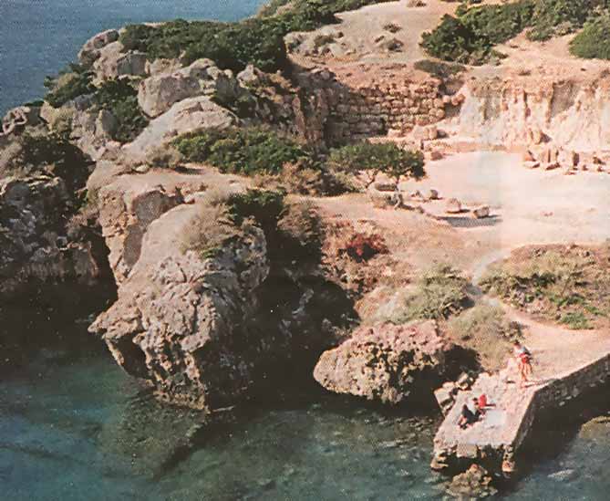 In fact, there isn't much to see: a long flat clearing that looks hewn out of the cliff face, some uneven masonry, stubby columns, the long arm of a stone jetty. But as I caught sight of it from the chapel/guardhouse above, I felt bewitched. The combination of the pale-white earth, the scattered patches of green skimming over grey rocks, and the peacock sea where some lucky souls were bathing seemed magical: I could not drag my eyes away. |