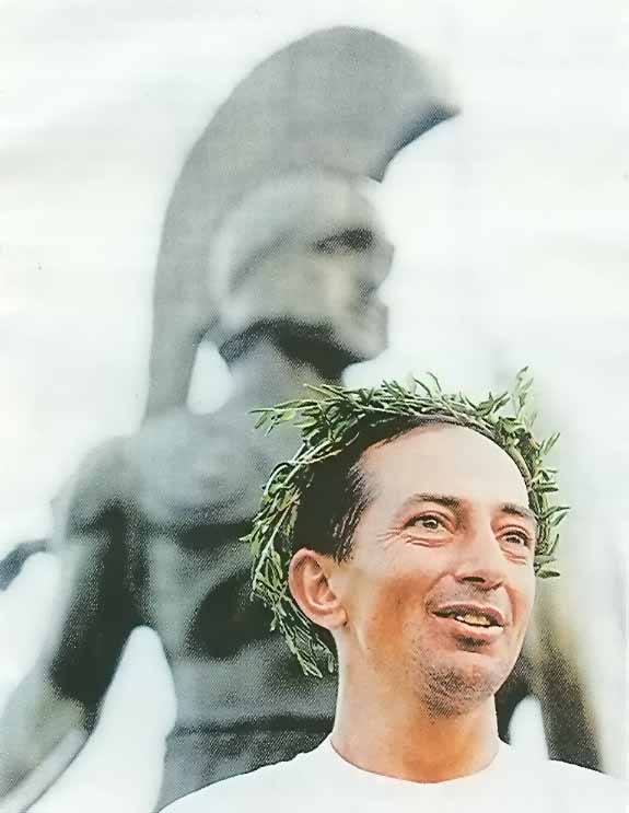 ![]() Markus Thalmann of Austria wearing an olive wreath after winning the Spartathon, on 27 September 2003, poses in front of the statue of Leonidas near the finish line. Thalmann finished the race in 23 hours 28 minutes and and 24 seconds |