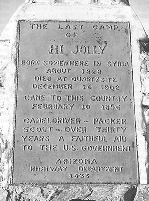 A vault in the base of the pyramid is said to contain a few old letters, Hi Jolly's government contracts as camel driver and scout, and less than a dollar in change (his total wealth when he died). The vault also contains something else, the ashes of Topsy, and the last camel from the original herd. As fate would have it Topsy had died in 1934 at the Garfield Zoo in Los Angeles nearly eighty years old. But Philip Tedro's exploits were not to fade from popular memory. The Ballad of Hi Jolly While everyone on the planet has heard of American folk songs only those who are familiar with this tradition know the rowdy ballad, Hi Jolly the Camel Driver. As with many such folk songs the lyrics often vary considerably. Here are three of the most often heard verses: Hi Jolly was a camel driver, long time ago/ He followed Mr. Blaine way out west-Yee-hawf/ Didn't mind the burning sand in that God-forsaken land/ And he didn't mind the pretty gals the best. I'm singin' Hi Jolly, Hey Jolly 20 miles a day, by golly 20 miles/ Before the morning light Wee-chaw! Hi Jolly, Hey ya Gatta get ani My way ya Told my gal I'd be home Sunday night. There's pretty girls in Albuquerque 'Least that's what they say, There's pretty gals in Tucumcari too Woo-hoo! But honey don't you mind I won't pay them anytime 'Cause I'm savin' all my lovin' just for you. I'm singin' Hi Jolly... Old timers down in Arizona tell you that it's true lIt's true! That you can see Hi Jolly's ghost a-ridin'throughIOoooh! When the desert moon is high He comes riding into sight Driving 4 and 20 camels over the hill I'm singin' Hi Jolly...[edd: The creator of this 1963 song and lyrics is Randy Sparks, founder of The New Christy Minstrels in whose album "Ramblin'" the ballad appears. Click here to read the complete lyrics, the correct version of Mr. Sparks's lyrics which he has so graciously granted permission to reproduce on 26 November 2007.] I have not been able to determine the origin or nature of this song. Is Hi Jolly the Camel Driver an anonymously composed folksong of the Old West? Or is this song a later composition of the late 1950s early 1960s American folk song revival? For the moment all that can be determined is that Randy Spears, one of the founding members of the New Christy Minstrels, is credited Christy Minstrels, is credited with the version heard on their recordings. The New Christy Minstrels on their self-titled premier album are the first group known to release a version of Hi Jolly the Camel Driver (c.f. Columbia CK 8855). This was not a novelty song. Just to quickly name four versions of this song we need only cite The Travels 3 version of this song recorded in 1963, then the Canadiana Folksingers offered their own take on this song on their This Land Is Your Land album in 1964, the Merrymen recorded a version in 1993 and you can hear yet another version on the River City Ramblers' 2001 album On Time. Other singers and groups could be cited. An entirely different venue dem-onstrates that Hi Jolly the Camel Driver is far from a forgotten ballad. Somehow this song of Hi Jolly became an extremely popular camp song. Many reports exist of American teenagers and children who first heard this ballad while sitting around the late night campfire. The song came at the end of a dramatic retelling of Hi Jolly's life and how he and his camels-as this campfire story goes-became restless ghosts. The camp fire story of Hi Jolly the Camel Driver has many variations of its own. Most Hi Jolly tales present the man lost and searching through a sand storm for Red Ghost last of the camels. Variants of the story have Hi Jolly either found dead next to Red Ghost or (once again) dead (only this time) tied to the great camel's saddle in the manner he would be during a sand storm. The horror of this ghost story has Hi Jolly riding the camel forever more. This is the meaning in the refrain: "You can see Hi Jolly's Ghost travelin' still, / When the desert moon is bright he comes ridin through the night Leadin' 4 and 20 camels cross the hill." This January 10th, the Quartzsite Chamber of Commerce will host the annual "Camelmania: Hi Jolly Daze." Quartzsite is located at the junction of Highway 95 and Interstate 10 on the western edge of Arizona. Quartzsite town limits are just nine square miles in size. The town cemetery (where the Tomb of Hi Jolly is located) is approximately one mile west on Business Loop 10 from the intersection of SR 95 and B-10. In broader terms Quartzsite is four hours due east of Los Angeles and two hours due west of Phoenix. The Colorado River is 17 miles west of town. In 1967, the Quartzsite Improvement Association held its first "Pow-Wow" which was meant as a civic celebration and to highlight the up until that time informal gem and mineral show. As one can see on the official Quartzsite website (www.ci.quartzsite.az.us/) this annual celebration is explicitly held to 'honor Hi Jolly.' Hi Jolly was not only a local prospector but his 6 foot tall grave marker is composed of local semiprecious stones and minerals. The "Hi Jolly Daze" opens with a parade that begins at the post office and goes west to the rodeo grounds. Camel races follow. Other entertainment includes swap meets, air balloons rides, a barbecue, games, musicians and gemstone conventions. This annual civic celebration transforms this tiny Arizona hamlet, of some 1,000 to 2,000 year round inhabitants, into a carnival with literally more than a million visitors. As reported in National " Geographic's, "ZipU5A," feature section seven months out of the year Quartzsite is transformed into ," "America's Largest Parking Lot (January 2001 Volume 199 No.1: 124-128)." This startling alteration of the landscape is due to the winter tourists who travel in recreational vehicles (or "Rvers"). "Within weeks 175,000 RVs cram inches apart into 79 trailer parks, onto front yards, and spill out seven miles on either side of town (Ibid: 126)." RVers flock to Quartzsite because of the w