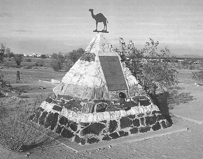 Tedro was buried in a simple grave with a wooden headboard. It is said that all the remaining old prospectors attended Hi Jolly's funeral. For more than 30 years, Tedro's grave lay forgotten, until James L. Edwards of the Arizona Highway Department had a handsome pyramid tomb erected over Tedro's gravesite in 1934. Ten feet tall the new grave marker is a pyramid-shaped monument made of the stones from the area such as black malapai rock, petrified wood, gold-bearing quartz, and natural red, white and blue rocks (symbolizing the flag). Some of these stones also feature ancient petroglyphs still to be seen on their exterior surfaces. Crowning the pyramid is the silhouette of a one-humped camel made of copper. |