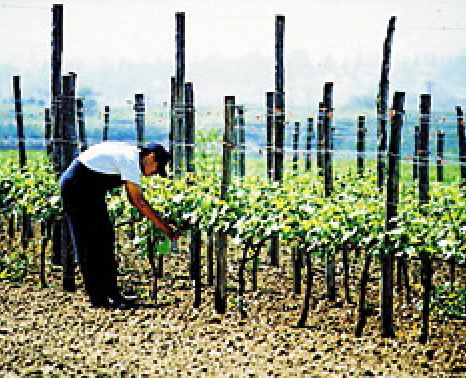 ![]() Rich pickings: an employee tends the farm school's vineyard |