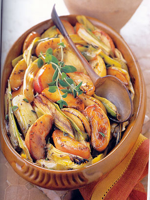 Serves 4 ![]() This exceptionally delicious mix of leeks and apples makes a gorgeous side dish that is perfect with plain roasted meats or chicken. Simple to make, it's great for parties because you can easily double or triple the recipe. 2 tablespoons olive oil 2 tablespoons white wine 1 tablespoon honey 1 teaspoon dried marjoram 1 teaspoon anise seeds 3 large leeks, white & tender green parts 1 crisp apple, such as Granny Smith or Fiji, cored & sliced Salt and freshly milled pepper 1. Preheat the oven to 400 F. 2. Whisk together the oil, wine, marjoram, and anise seeds in a medium baking pan until combined. Quarter the leeks and slice into 2-inch pieces. Add the leeks and apple to the dressing, season to taste with salt and pepper, and toss to coat. 3. Bake for 30 minutes, stirring gently about every 10 minutes, until the leeks are golden and the apple is soft. Serve immediately.