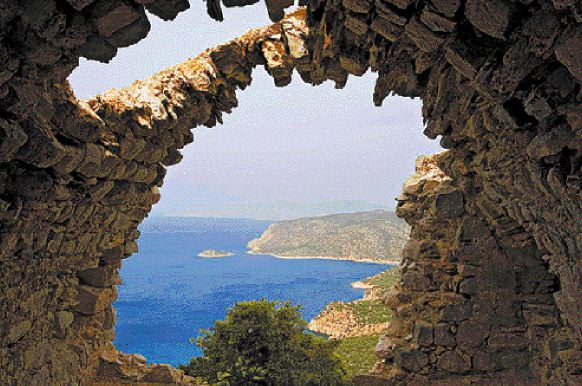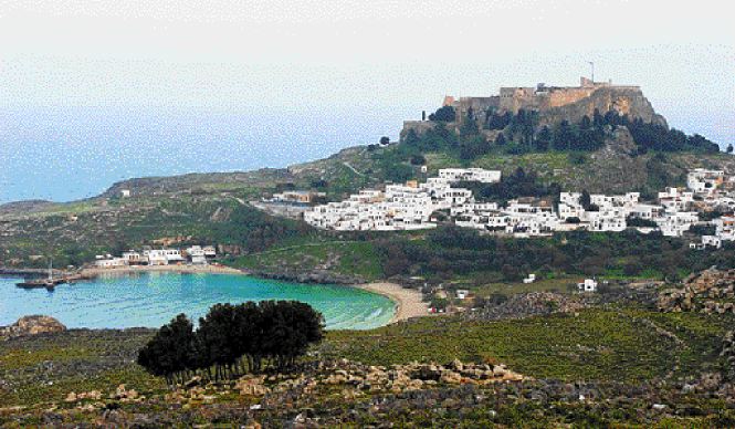 We continued on the main road towards Monolithos. We passed the ruins of the ancient city of Kameiros and the dark, craggy slopes of Atabyron, the chief mountain of the island, and took the steep, winding road that leads to the fortress, one of the three main castles of the knights - Monolithos, Pharaclos and Lindos. Situated on the top of a precipitous rock called Monopetra and accessible only by a single, narrow path, Monolithos is the most spectacular castle in Rhodes. The rough climb to the top where the Byzantine church of Agios Pantaleonos still stands, is well worth the effort. The views of the mountainous interior of the island, on the one side, and the deep blue Aegean on the other, are magnificent.