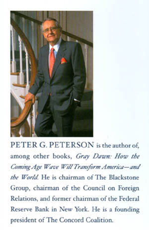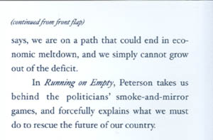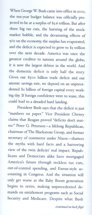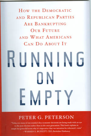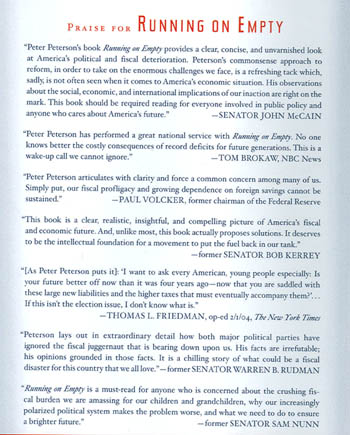 Running On Empty By Peter G. Peterson ![]() ![]() ![]() ![]() ![]() "Like a million of other Americans, I didn't always feel this way. As it happened, I was born a Republican, and for most of my life it felt easy and right to be one. My father was a Greek immigrant and small businessman who taught me to value thrifts, stewardship, individual responsibility, and compassion for the poor. He started out as a railroad dishwasher who slept in a caboose to save on rent. He settled in Kearney, Nebraska, and used his savings to start the inevitable Greek restaurant. With the help of my mother, he ran it 24/7 for twenty-five years so that my brother and I could "get the best education money could buy." Meanwhile, if an unemployed person came to the back door of the Central Café asking to be fed-and during the Great Depression there were countless numbers-none went hungry as long as they were willing to do some honest labor. These values were reinforced when I arrived at the University of Chicago and learned from its famed economists about the virtues of open markets, the hazards of too much government, and of course the importance of fiscal responsibility. From Milton Friedman I learned that in public finance, as in life, there is no such thing as a free lunch. You borrow today, you pay tomorrow. As for permanent tax cuts, Friedman taught us they were a fine idea as long as we remembered that they were not tax cuts at all unless accompanied by permanent spending cuts. Otherwise, they were simply a shift in taxes to future taxpayers-which is to say a tax cut for us, but a tax increase on our children." |