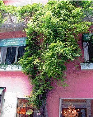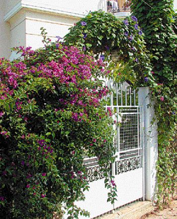 becomes settled in the container that will be its longterm home. Even then, you will need to be vigilant about watering and feeding. During the summer your potted climber will almost certainly need watering every day. A twice yearly application of slow-release fertiliser (in March and October) is necessary and in the case of fast growers such as bougainvillaea, a once-a-month-feed during the growing season with liquid fertiliser will help things along. The more vigorous the climber, the more attention it will need - for example, bougainvillaea and wisteria will need root pruning every few years or they will quickly outgrow their pots and exhaust their nutrient supplies. However, if you are willing to carry out these occasional but crucial maintenance tasks, the sky's the limit, so to speak. Aside from the challenge of limited space, balconies are often exposed to high winds. They get little protection from the elements without the buffer afforded by trees, shrubs, hedges and fences as do gardens on ground level. Air turbulence stirred up between tall buildings adds to the problem. One solution is to put up trellis or netting - not only to provide support for climbing plants but also to give initial protection from the wind. Resist temptation to build a solid wall as that will itself cause turbulence: the best windbreaks are 50 percent permeable. If you choose netting, select a small mesh size - the bigger the mesh the less effective the windbreak. Make sure it is securely fixed - the extra wind resistance produced by the foliage of the climbers as they start to clamber over the net could turn your windbreak into a sail flapping in the wind. |