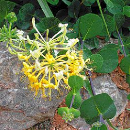 Ivies (Hedera spp) and honeysuckles (Lonicera spp) are happy in shade and will do well next to a wall even under a deep overhang. Both are also wind tolerant. Honeysuckle of course has the advantage of spring-time sweetly-scented flowers. However, it will need some control and occasional root pruning if it is not to outgrow its space and quickly tire. Prune by removing the old wood after flowering - this is best done every year or it will become messy. Virginia creeper (Parthenocissus quinquefolia) is another vigorous climber that nonetheless thrives in a pot. Trouble free with little pruning required, in return it clothes a wall in brilliant colour for autumn - and will do so in semi-shade or sun. |