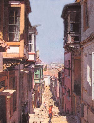 Behind the Bazaar quarter lies the Roman Agora, Smyrna's most ancient surviving monument; in its main courtyard, marble fragments from objects as diverse as Corinthian capitals and Ottoman gravestones are arranged in irregular piles. The nearby district of Variant is a network of ascents to Kadifekale, the castle on Mount Pagus that still dominates over the city. It would have been impossible to a Greek or a Levantine a century ago to conceive that the city's Muslim quarter would once become its most charming partinstead of their lavish quarters by the bay. Having been spared the flames, the area is a dormant, at times dilapidating, mausoleum of Smyrniot architecture, its alleys and deserted squares home to modest houses and mosques in that particular "rococo" so praised by Seferis, a Smyrniot himself. During the burning summer heat, there is not much movement on the streets; people are locked inside behind windows, many of which still conserve the wooden grills that allowed Muslim women to look without their features being seen by male passers-by. |