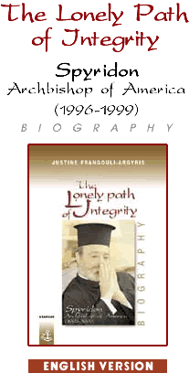 Mr. Kotrotsios was impressed with the apocalyptic nature of the book and considers The Lonely Path of Integrity a work of major importance for the Greek American community and Orthodoxy at large. John Catsimatidis, the former president of the Archdiocesan Council will host a reception introducing the book on Saturday, April 6, 1pm. at the Trump Taj Mahal. The author, Justine Frangouli-Argyris, will be present to meet guests and sign copies of the book. The English edition of Spyridon's biography has been enriched with two previously unpublished official reports written by his Eminence evaluating the state of Orthodoxy and Greek Education in Italy and the United States. The biography of Archbishop Spyridon is an authorized account of the life and times of a modern Church leader, a prelate who attained the highest station in the Greek Orthodox Church of America after many years of struggle and service to the Church. Yet, after only three years, as it became evident that he would not serve the dubious schemes of the Ecumenical Patriarchate, the Center of World Orthodoxy in Constantinople, he was deposed and exiled to a non-existent Diocese of an ever-diminishing See. More than an insider's look at the journey of an Archbishop, who, thanks to a priestly family tradition entered the life of the Church in his early childhood, this book traces the path of a young man: born in America, matured in Greece, educated in Europe. Finally, having faithfully served his Church in Switzerland and Italy for twenty-five years as priest and bishop, he returned to home, to the land of his birth, as Archbishop. His multifaceted life and ecclesiastical career portray a man who initiated a special era in the life of the Orthodox Church in Italy and America, who struggles with preserving the historic Orthodox Tradition of Byzantium and the survival of Hellenism in the diaspora. Archbishop Spyridon, who today has withdrawn from active Church service, bears personal witness in the pages of this book -- through his diaries, personal notes and journal entries -- to the dramatic three years that marked the history of the Greek American community. (Exandas) |