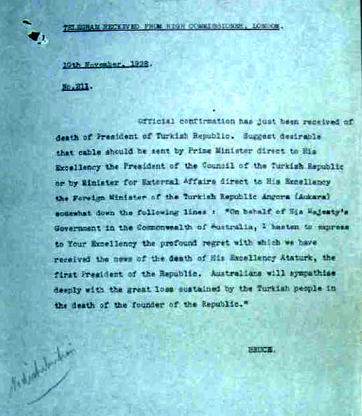 The document shown below is from the National Archives of Australia digital collection. Stanley M.Bruce, the Australian High Commissioner in London, notified Canberra on November 10, 1938 of the death of Mustapha Kemal Ataturk. It will be noted that Bruce was Australian Prime Minister 1923-1929 and lost his Federal seat in the 1929 election. He also served as Australia’s representative to the League of Nations in Geneva during the 1930’s. Bruce represented Australia at the Imperial Conference held in London in October 1923. On his return to Australia, he visited the Gallipoli cemeteries. He arrived in Constantinople on February 6, 1924 , accompanied by Sir Fabian Ware on board the Orient Express, and was well received by the Turks. Bruce took the time to do some sightseeing around the main sites of Constantinople, such as Santa Sophia, and also dined at the British Embassy. From February 8-10, Bruce spent his time inspecting all the cemeteries at Helles, Anzac and Suvla on the Gallipoli Peninsula and “laid a wreath on the great stone of the cemetery at Anzac Beach”. Bruce persuaded the Turkish Governor of Gallipoli of “the depth of Australia’s interest in these cemeteries, and he [Bruce] is satisfied that his visit was not without important influence on the native mind in their attitude towards memorials of such hallowed interest to Australians”. For the Australian leader this visit brought back memories of 1915 where he had served with the 29th Division of the British Army. It would appear that Bruce was the first Dominion or British leader to visit the new Turkish Republic of Mustapha Kemal. Bruce arrived back in Australia in late March 1924 to resume his prime ministerial duties. It will be pointed out that Australia and the Ottoman Empire were enemies during the First World War. Gallipoli was the scene of battle with Australian and New Zealand Army Corps (Anzacs) and British forces fighting the Turks close the entrance of the Dardanelles. Both sides suffered terrible losses. It was during the Gallipoli campaign that Mustapha Kemal established his reputation as a fine military commander by rallying and leading his troops to victory over the British expeditionary force. Both the Australians and Turks respected each other fighting qualities at Gallipoli. In fact the Australians referred to their enemy as “Johnny Turk.” In conclusion it could be argued that Bruce admired Ataturk as a political and military leader. Source: National Archives of Australia, Canberra ACT . Series A981 Tur 13 part 2 Turkey-Internal General 11 1938-1942 Stavros T Stavridis, Historian/Researcher, National Center for Hellenic Studies and Research, Latrobe University, Bundoora, Victoria, Australia |