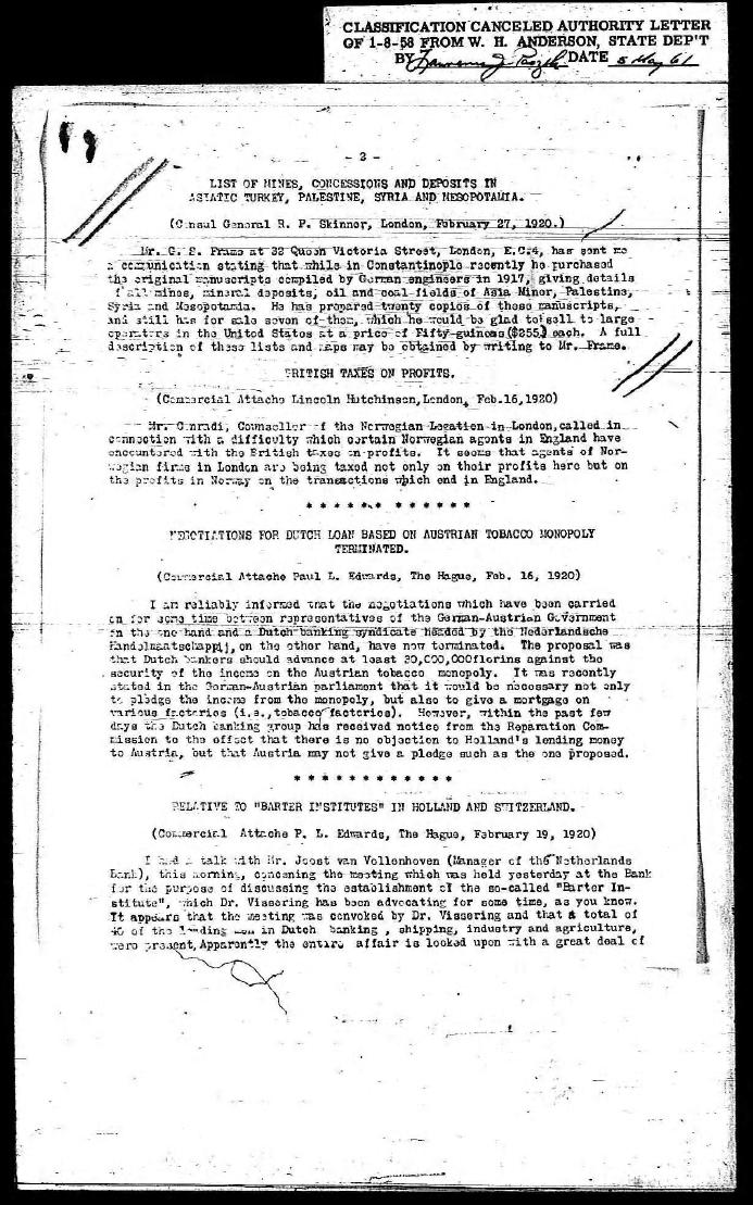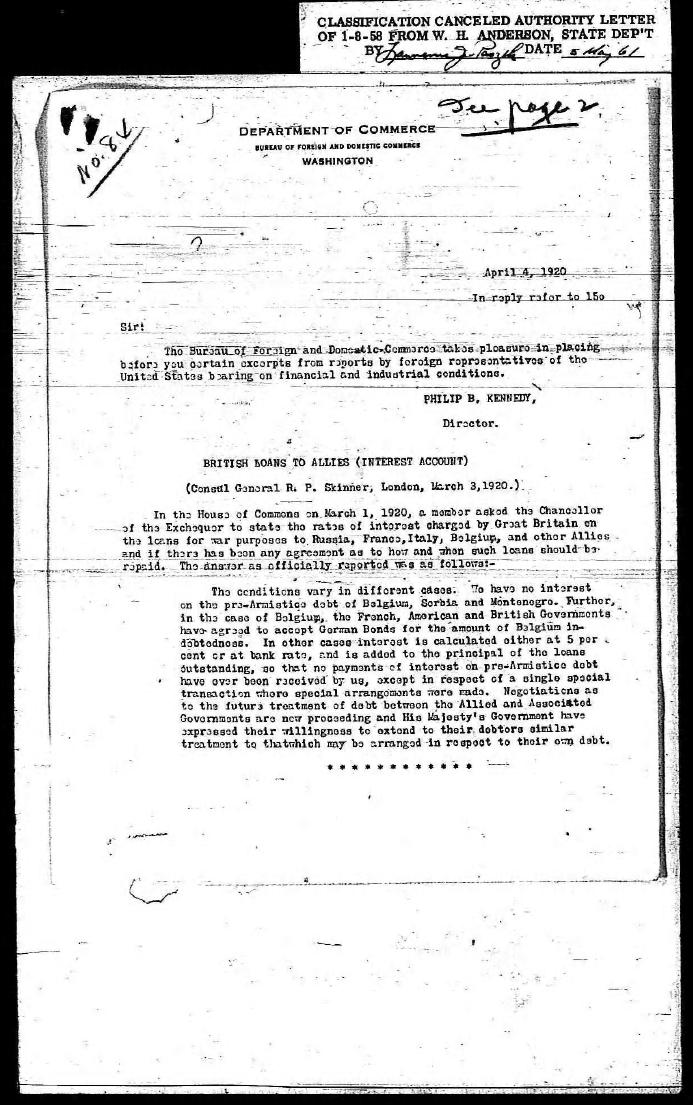 This official, 3-page U.S Department of Commerce document [below] dated April 4, 1920 is based on excerpts from reports by American representatives posted in London and the Hague concerning financial and industrial conditions . |