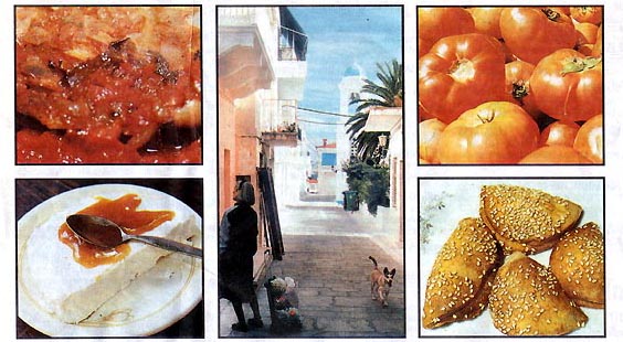 When this came, we blessed the lateness of the hour that made us stop at the local café for a meal. Neither of us had eaten such delicious eggs for years. The tomatoes had nothing in common with the wet, coloured cardboard-like spheres that we taste when we buy them either at the local street market or at health food stores. The fact that the latter sell organic products says nothing about the taste of these products. If you start with a tasteless tomato, organic cultivation will make it safer to eat, but not necessarily tastier. The tomatoes we were served were simply heavenly. And so was every other thing we ate and drank that evening. From the early travellers, such as the Frenchman Jacob Spon and the Englishman George Wheeler, who visited the island in 1675-76, we hear that Tinos had the largest population and the best cultivated lands of all the Cycladic islands. Similar remarks were made the French academician Pitton de Tournefort, around 1700, adding that the island’s principal source of wealth was its silk, exported mainly to France. A little later, the Frenchman Charles de Saint Maure (around 1721) praised the silk embroideries and the fine stockings for ladies, while fifty years later another Frenchman, Cloiseul-Gouffier, praised the beauty of Tinian women, who do know how to cover but do not know how to hide their beauty. Similar observations were made by a German, Johann Hermann von Riedesel, a few years earlier, who adds that the Tinians were the smartest and the most cultivated of all Greek islanders. All this is reflected in facts, such as that the island had 67 villages until earlier last century (now there are only 46), and that during the 1821 revolution, which resulted in Greek independence, the taxes assessed to Tinians show them to be the wealthiest of the islanders. The beautiful dovecotes (peristerones) that grace most villages of Tinos furnish a continuous supply of excellent organic manure used by the tillers of the land in their cultivation, and this ensures the production of organic products. Unlike many other Cycladic islands, Tinos is still largely unspoiled by the tourist trade. Only around the middle of August, crowds of Greek pilgrims arrive on the island for the celebration of the feast of the Virgin (Megalohari) on the 15th of the month. This sudden influx strains the resources of the island to the utmost, but the Tinians have found ways of coping with and profiting from the annual ritual. Tinos is a movable feast, as Hemingway would say, and in every village of the island seek out the small, unprepossessing restaurant or café, and have something to eat and drink there. Chances are you will leave the place enchanted with the local tastes and the friendliness, kindness and hospitality of the people. Recipes Potato pie (Patatou) (Serves 8-10) 2 ½ kilos small potatoes 1 large onion, finely chopped 1 tbs butter 1 cup grated Kefalotiri cheese 4 eggs, slightly beaten ½ cup milk ½ cup crushed rusk ½ cup parsley, finely chopped 1 tsp oregano 1 tsp nutmeg salt, pepper to taste 2 tbs olive oil Wash the potatoes and boil with their skins. When cold peel and mash with a potato masher. Saute the onion in 1 tablespoon butter and allow to cool. Put the potatoes and onion in a large bowl and mix with the cheese, eggs, milk, crushed rusk, finely chopped parsley and oregano. Combine well and add the nutmeg and salt and pepper to taste. Coat a baking pan (25x35cm) with butter. Spread the mixture, which should be quite thick, evenly. With a fork make a pattern of squares on the surface. Pour the oil over the top and bake in a 175C/350F oven for about 1 hour or until golden brown. Serve warm or cold with a green salad. Sweet cheese pie (Skepasti) 1 kilo Anthotiro cheese 6 eggs, slightly beaten 2 cups sugar ½ tsp ground mastic ½ tsp cinnamon 2 sheets shortcrust pastry (from the frozen section of the super market) Mix the first five ingredients well in a bowl. Coat a baking |