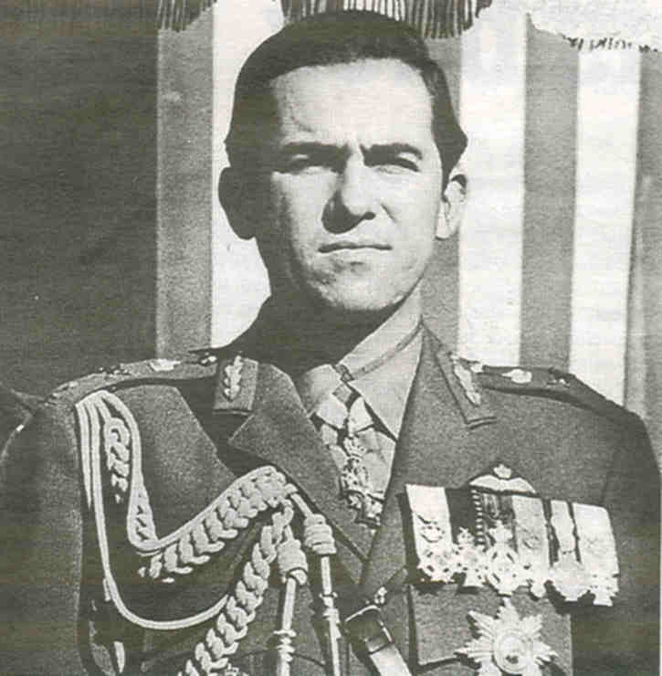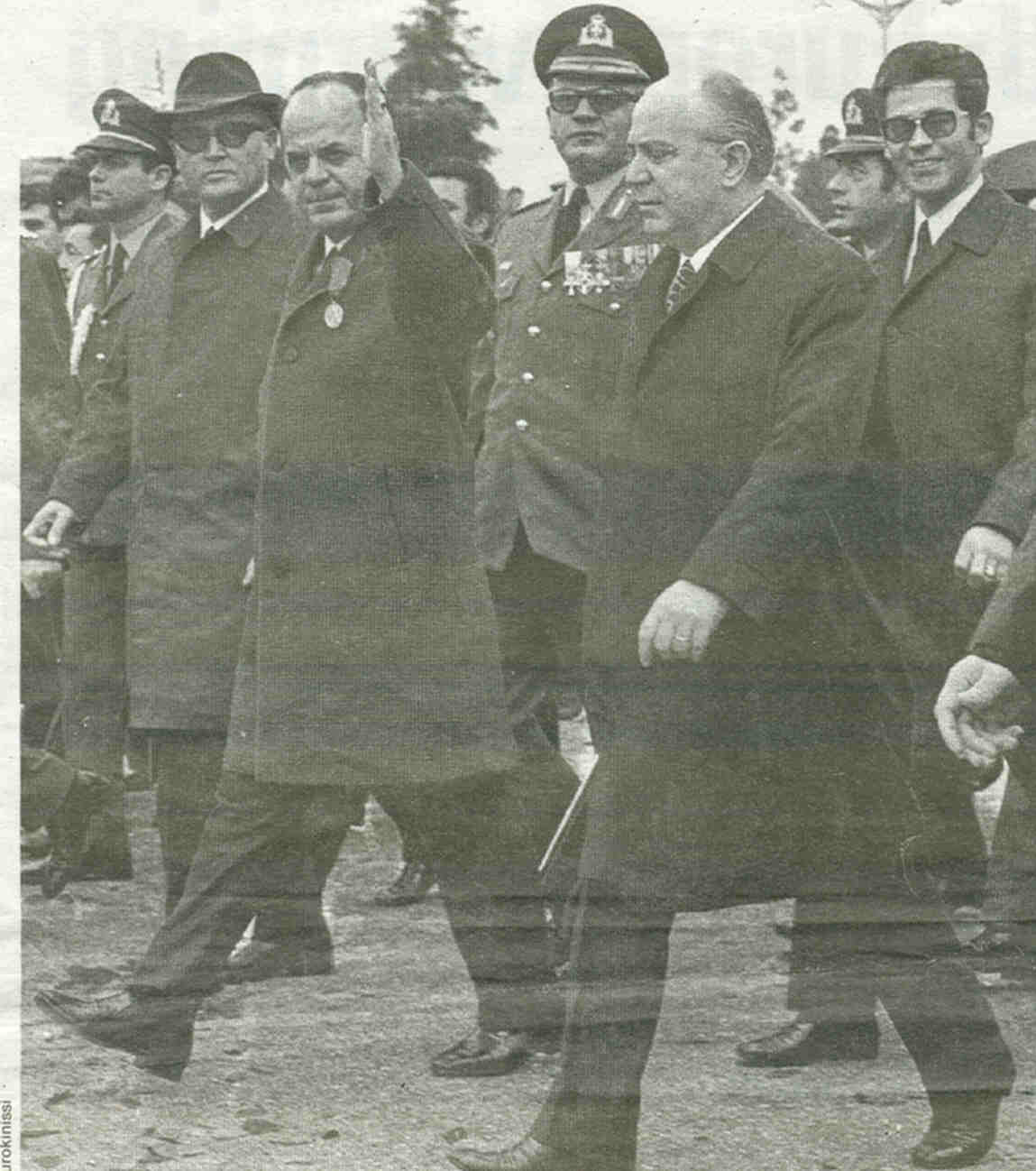![]() Colonels George Papadopoulos (waving) and Nikolaos Makarezos (looking down) |