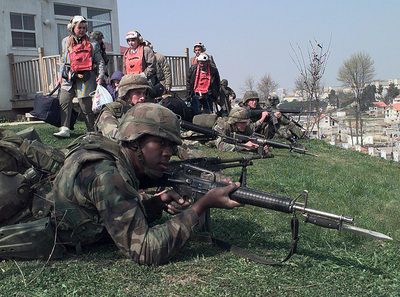 ![]() American citizens board a U.S. Marine Corps helicopter in a field inside the U.S. Embassy housing compound in Tirana, Albania, on March 15, 1997. DoD photo by Petty Officer 2nd Class Brett Siegel, U.S. Navy. |