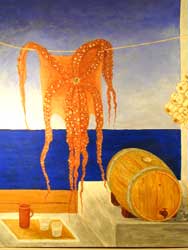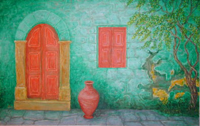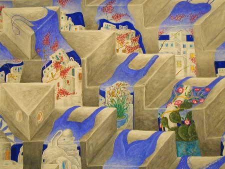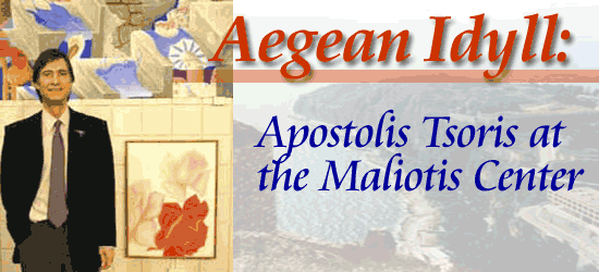 The art of Apostolos Tsoris conveys the feeling of an idyll among the Aegean islands. The world he depicts in his vibrant, colorful paintings is one of blue church domes, sailboats, roosters, bouzoukis, wooden chairs, and wine. | ![]() |
