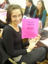 ![]() Scholar Diamanto Ktenas holding a flier to Learn Modern Greek |