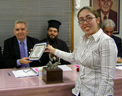 ![]() Scholar Alexandra Gialaboukis presenting an Appreciation Award to outgoing president George Alexiou |