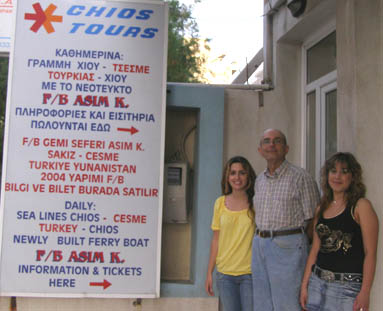 It is thirty years since I went to Chios. All our family is deceased. I asked Panchiaki Koraes Society of Flushing, New York for a travel agency. Their response: Chios Tours. The agency is owned by Michalis Kolokythias, who has family ties with the village of Tholopotamousis. His uncle is the internationally famous educator Constantine Parthenis. Chios Tours was established in 1980, representing numerous tour operators, charter airlines and international cruise ships. Their website shows promotions at Karfgas Beach, Megas Limnionas, Sun village Hotel, Agia Fotini Beach, Avgonina Village and Olympic Village. I emailed for hotel reservations and island excursions. Twenty-three year olds Maria Kolokythias and Katerina Samata took personal interest in arranging my trip. |