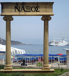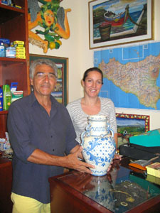 The first Greek colony in Sicily was in Naxos,” said Dr. Gaetano Cipolla. “We are Greek-Sicilians.” This was my introduction to a fabulous two day stay in Giardini-Naxos on Sicily’s Ionian sea coast, during a recent Arba Sicula Society tour. Our stay began in June at the all inclusive hotel Caesar’s Palace. A Greek flag was prominently displayed at the entrance with other international flags. Greek columns and vases were displayed, next to oleanders. Rosario Scandurra, owner of the Caesar Palace Gift Shop, said “we love our American clients. Greeks are like family for us. Naxos in Greece has a special relationship to us. We are twins and have mutual relations.” A four foot tall Greek vase decorates the entrance to his shop. |